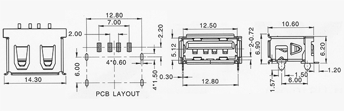 產(chǎn)品描述:USB AF 10.6四錐腳有卷邊SMT