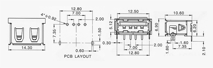 產(chǎn)品描述:USB AF 10.6兩叉腳有卷邊90度